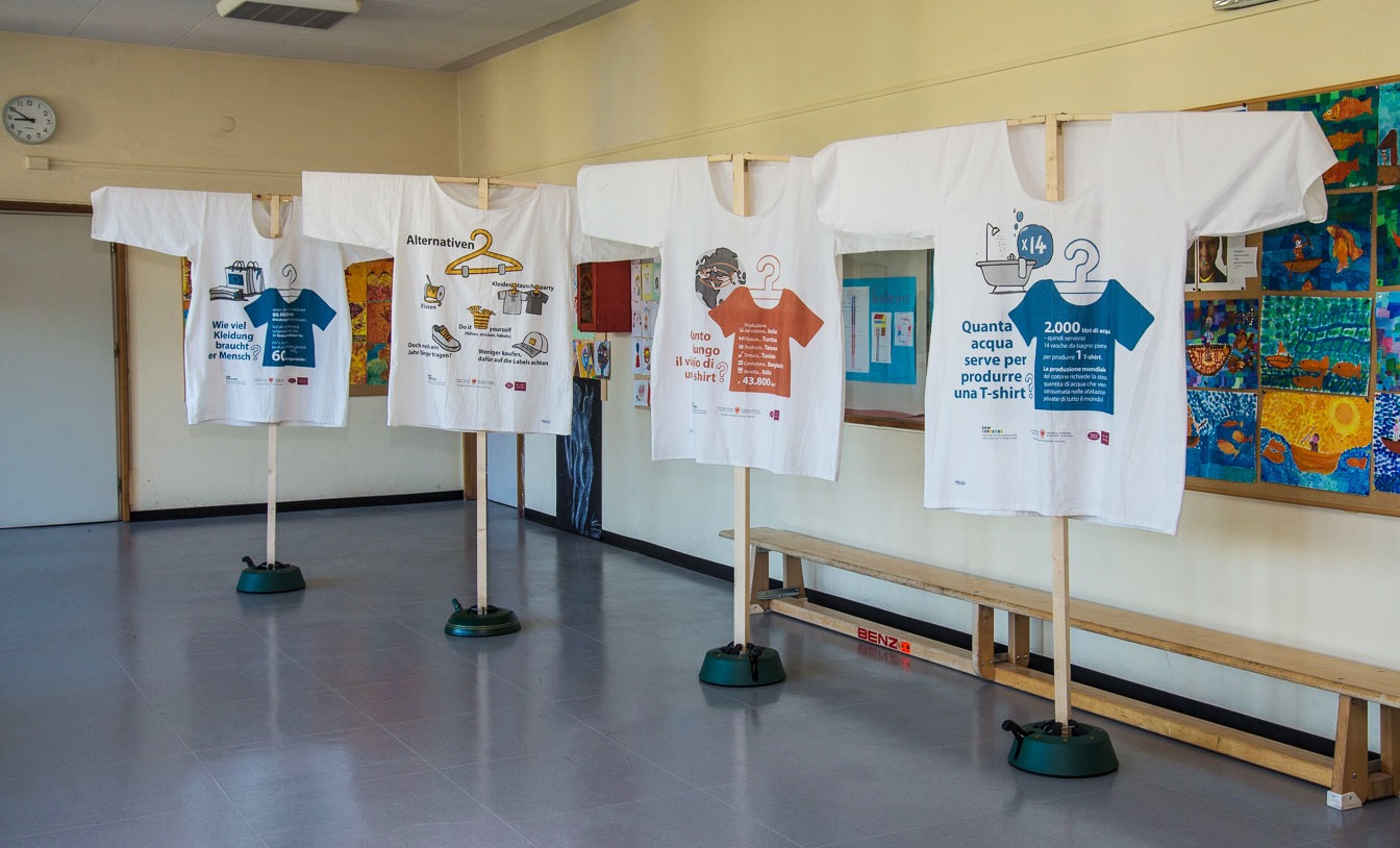 Wie viel verdient ein*e Näher*in in Bangladesch? Wo wird Baumwolle angebaut und wie viele Pestizide werden verwendet? Welchen Weg legt das T-Shirt zurück, um in unserem Kleiderschrank zu landen und auf welche Siegel können wir achten? Zehn übergroße T-Shirts geben Antworten auf diese und weitere Fragen zur globalen Kleiderproduktion.