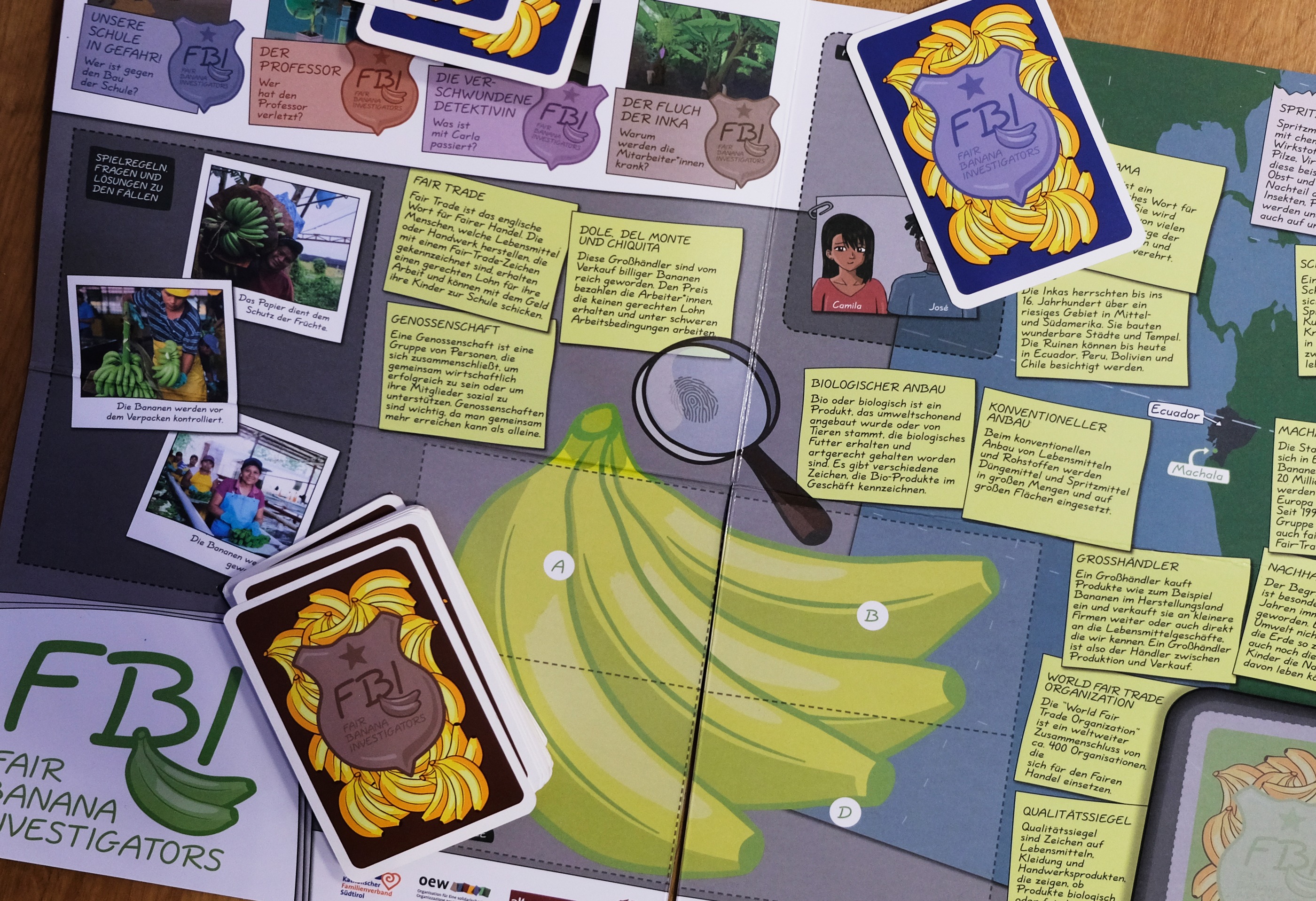 Das Karten- und Brettspiel „FBI – Fair Banana Investigators“ lädt ein, Kriminalfällen im Bananensektor kritisch auf den Grund zu spüren. Die Spieler*innen beschäftigen sich mit Fakten der Bananenproduktion und entscheiden gemeinsam, wie sie die Geheimnisse lüften.