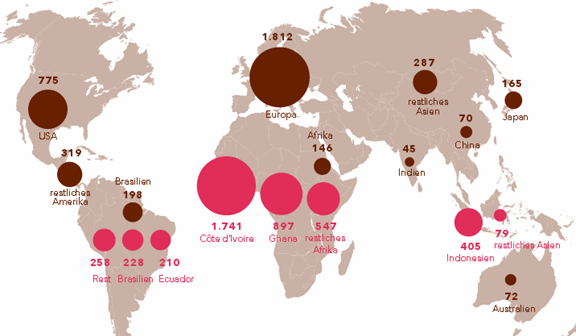 Die Kakaobohne ist von ihrer Geschichte her ein klassisches Kolonialgut. Der Kakaobaum wurde aus Zentralamerika in Westafrika heimisch gemacht und dort von den Kolonialmächten für den europäischen Markt angebaut. Alle Verarbeitungsschritte von der Vermahlung bis zur Schokolade werden heute in europäischen Fabriken durchgeführt. So bleibt umgerechnet 87 Prozent der Wertschöpfung in Europa. Die Kakaobauern bekommen vom Verkaufspreis einer 100-Gramm-Tafel Milchschokolade nur 6,6 Prozent. 1980 betrug dieser Anteil noch 16 Prozent. Vor allem die Supermärkte beanspruchen einen immer größeren Anteil für sich: Er beträgt über 45 Prozent. Auf die Schokoladeunternehmen entfallen zirka 35 Prozent. Es gibt aber Versuche, Verarbeitungsschritte in die Anbauländer zu verlegen. So würden mehr finanzielle Mittel im Land bleiben. In der Elfenbeinküste und in Ghana wurden einzelne Kakaomühlen in Betrieb genommen. Im Mai 2015 eröffnete in der Elfenbeinküste die erste Schokoladefabrik.